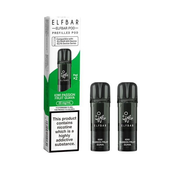 Elf Bar 600 Pods Kiwi Passion Fruit Guava comprises two prefilled pods, each holding 2ml of e-liquid. Containing kiwi, passion fruit, and guava flavours. Compatible with the Elf Bar 600 Prefilled Pod Kit, device is not provided.